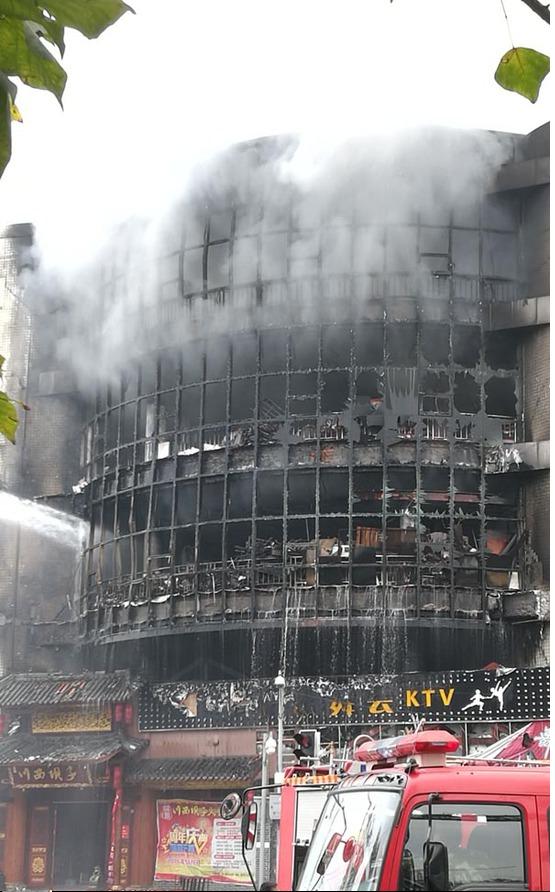 煙,樓房的外表已經(jīng)被全部燒黑。6臺云梯消防車分布在大樓的四周,一起向大樓